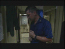 | (Bartnick) This is Operations Department locker room. This is where they have their lockers. As you can see, you have to walk across the main passage to get here. There are 21 lockers for 21 men, so they have a place to hang their clothes. |